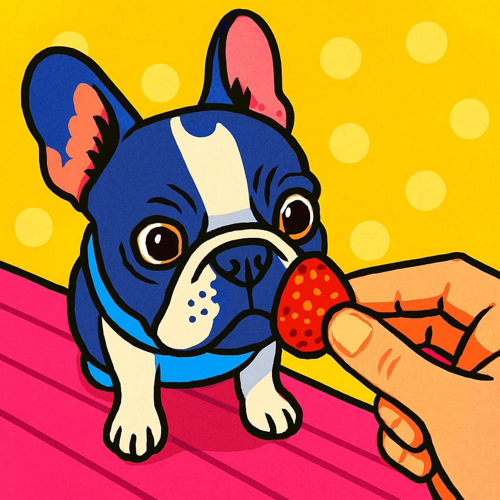 真っ赤なイチゴに惹かれるフレンチブルドッグのまなざしを、ポップな色彩で描いたAIイラスト素材です。
