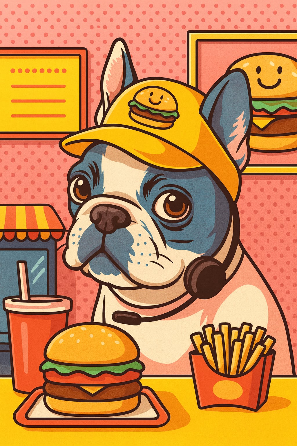 ハンバーガーショップで楽しく働くフレンチブルドッグを、ポップで明るい世界観で描いたAIアート作品です。