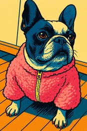ピンクのふわもこジャケットを纏ったフレンチブルドッグを、ポップアートの手法で描いたAIアート作品です。