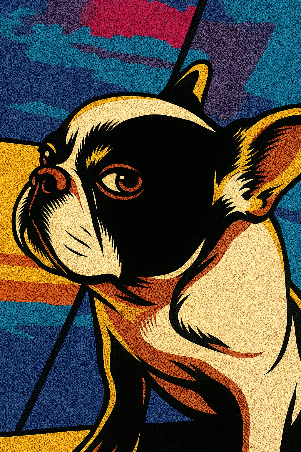 フレンチブルドッグの静かなまなざしが、色彩の中に浮かび上がる。